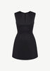 Sleek and sculpted, the Kelly mini dress is cut from structured, mid-weight fabric in deep black. A clean crew neckline with a slim front slit meets a nipped waist and crisp A-line skirt—your modern little-black-dress for dinners, dates and events.