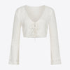 A cropped cardigan with a deep V and twin tie closures, crafted in an airy-yet-cozy pointelle knit—an elevated layer that works from office to evenings.