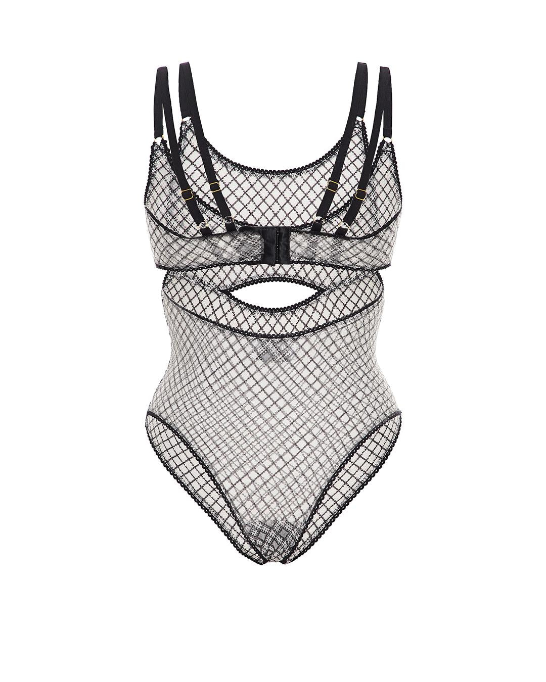 Mesh semi-transparent bodysuit with a double layer imitating a bra and adjustable double straps