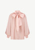 Floaty and romantic, this petal-pink blouse is cut from 100% silk with a feather-light, semi-sheer finish. An oversized tie-neck bow frames the face, while blouson sleeves and neat cuffs add soft volume—polishing denim, tailoring, or a slip skirt in one move.